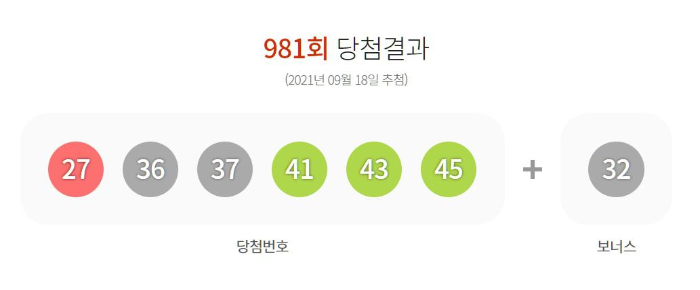 2등 보너스 번호는 32이다. 27 36 37 41 43 45 보너스번호 32. 로또 981회 당첨 번호 추첨 로또 981회 1등 20억원씩 13명 로또 1등 2등 당첨지역 공개 오늘 로또 1등 당첨번호 27 36 37 41 43 45번 보너스 번호 32번 당첨 로또982회 예상번호 무료 추출하는 로또 복권.