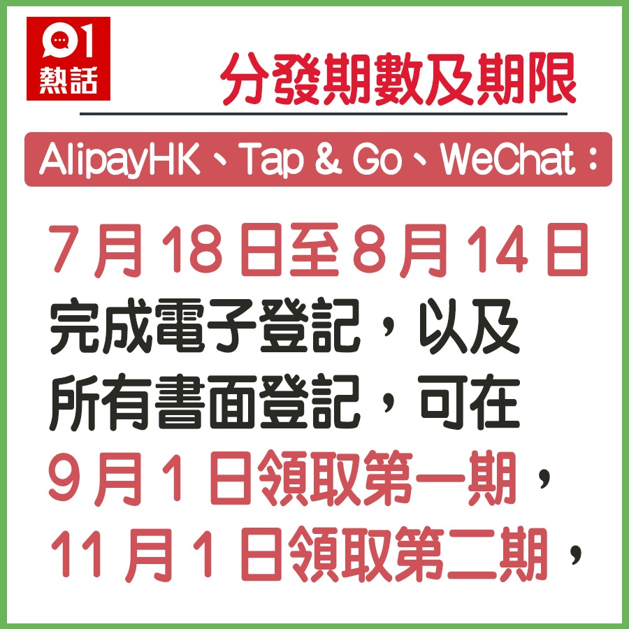 提到5000元消費券的登記方法因應不同支付工具的技術限制採用支付寶香港Tap GoWeChat Pay HK與八達通的分發期數及每期領取金額都有不同 WeChat Pay支付. 7 月 18 日至 8 月 14 日完成的電子登記及所有書面登記.